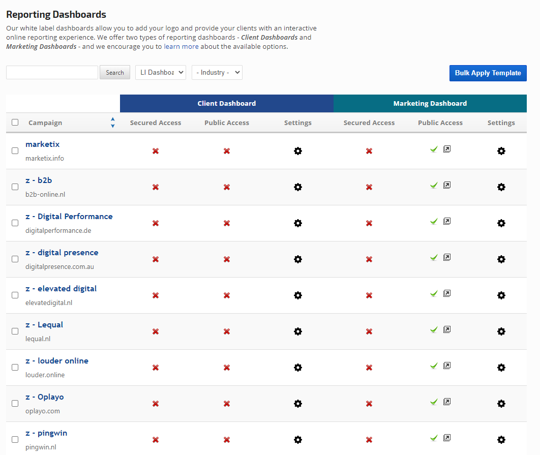 In the White Label menu click on Dashboards to access a list of all Marketing Dashboards of campaigns in the account