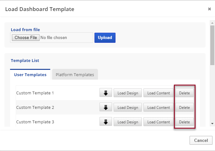 Click the Dashboard Templates Load button, locate the template you want to delete and click the corresponding Delete button.
