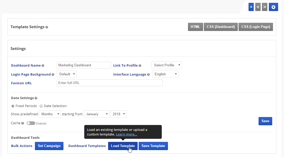 Warning! Loading a report template will overwrite any pages and settings that currently exist in the Marketing Dashboard of the campaign you're working on.