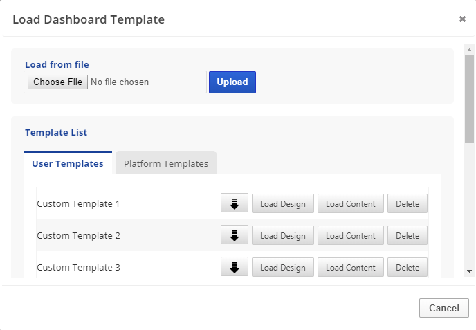 When you have uploaded or created and saved dashboard templates, then you may choose to load the design and/or report content in any campaign by clicking the corresponding button.