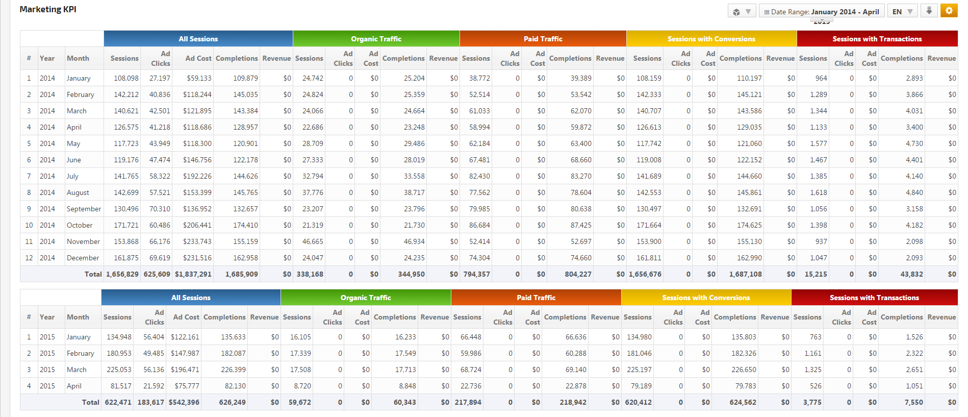 Measure and analyze the performance of online marketing campaigns and monitor trends with our Marketing KPI report. Select up to 5 segments at a time to create customized reports to determine Advertising ROI, the value of Mobile traffic, Referral and Direct vs. Search traffic or Organic traffic vs. Paid traffic, Goal Conversions, Revenue, user type and behavior, etc.
