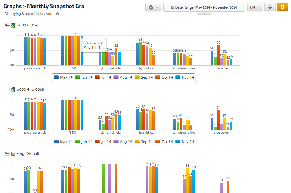 Analyze keyword progress with Monthly Snapshot Graph that displays the rank or average rank for selected keywords by month, over a specific period of time.