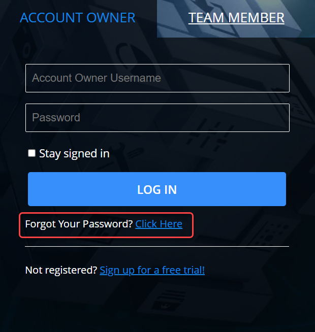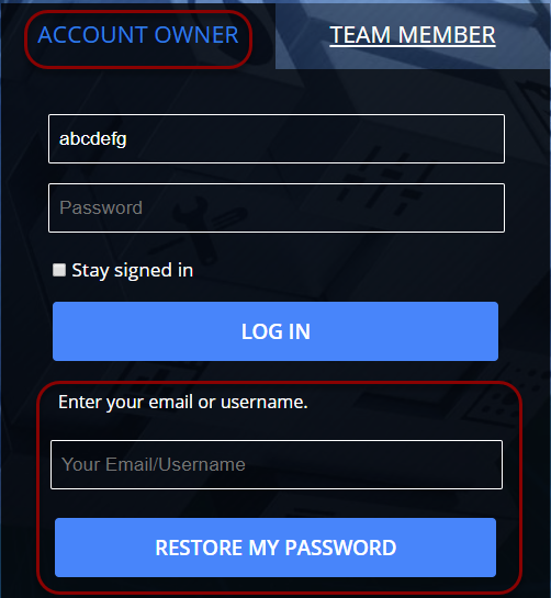 Enter either the Account Username or Account Owner Email address and click the "RESTORE MY PASSWORD" button. An email containing a password reset link will be sent to the Account Owner Email address.