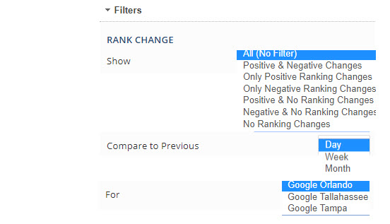Rank Tracker Dashboard displaying 100+ as the rank result for several keywords. Options exist in the Account Settings > Theme & Localization screen to set no rank within tracked results as "100+", "N/A", "NR", or "-"