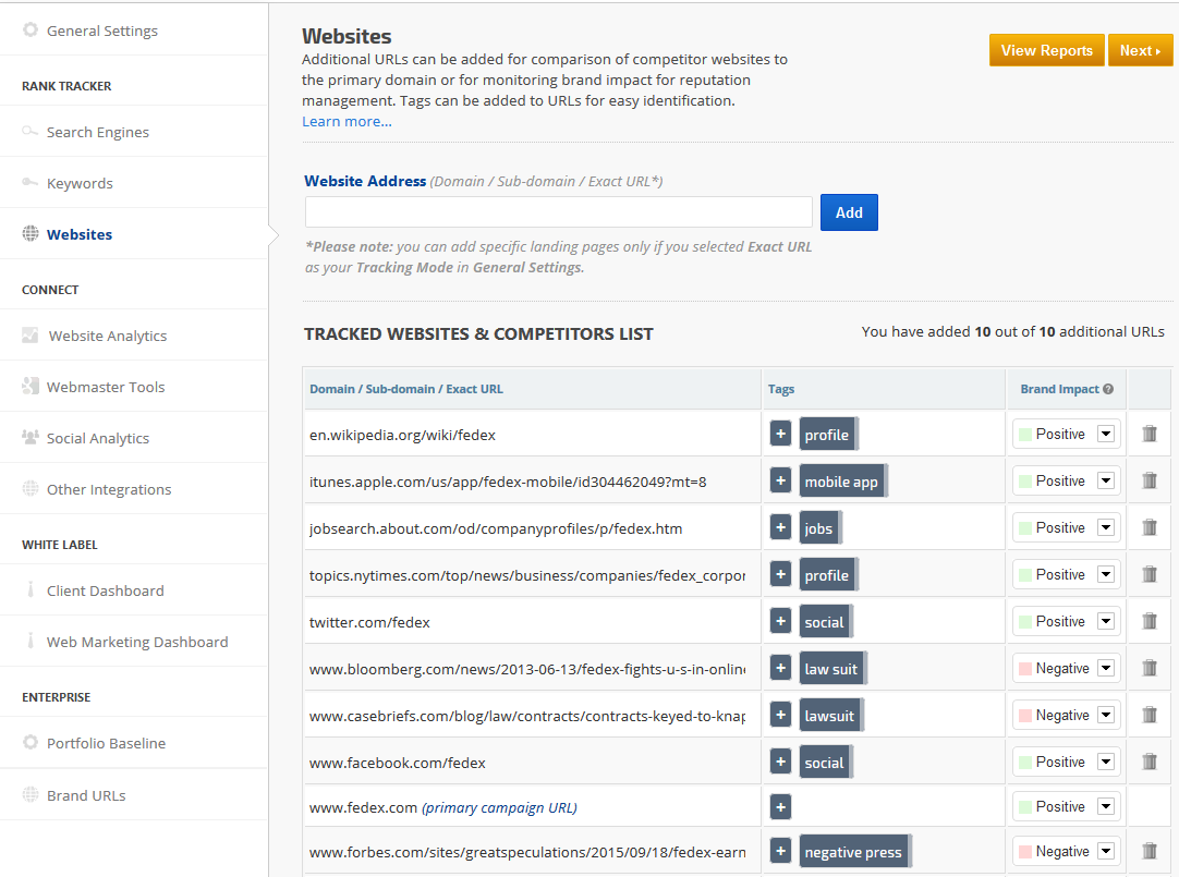 Brand Impact URLs can be set up in the Campaign Settings > Websites screen. Please refer to Reputation Management Campaign Setup for more information.