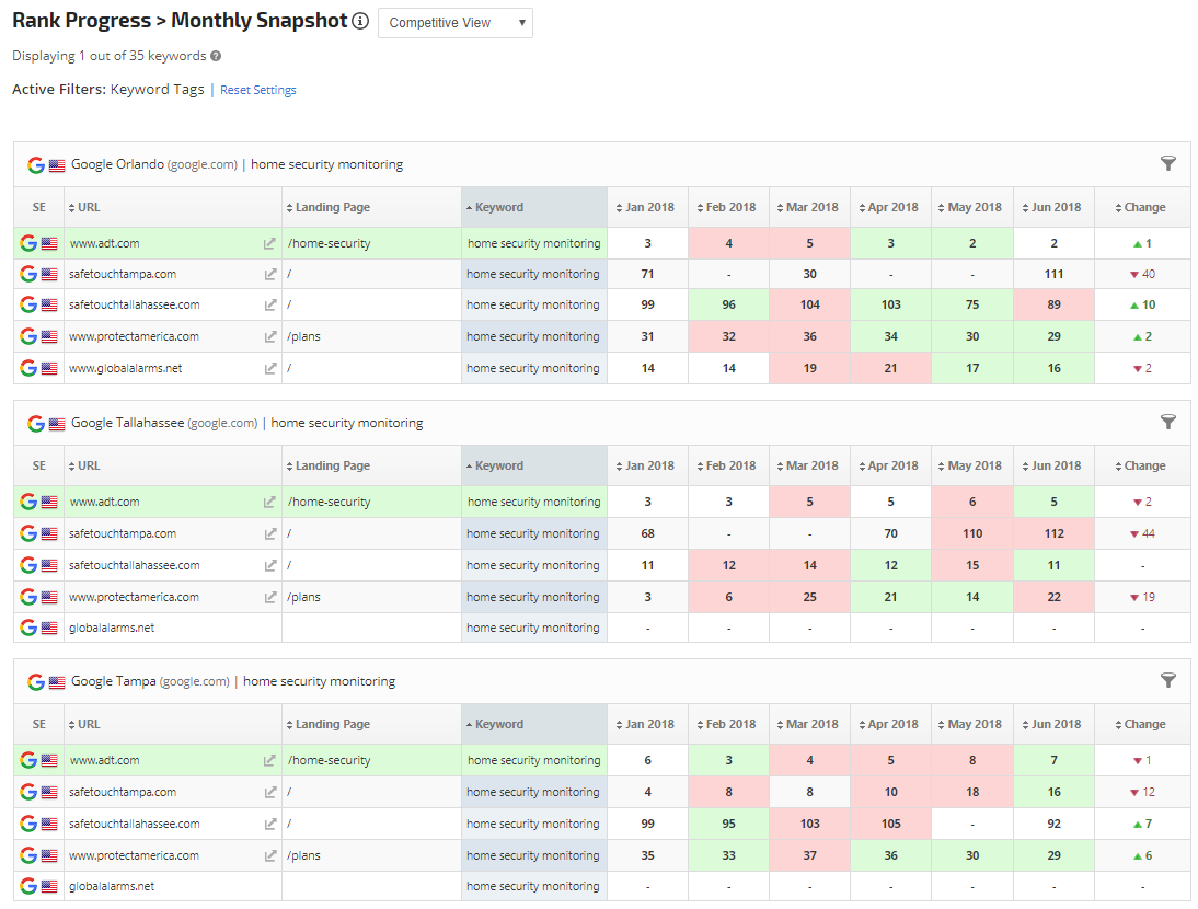 By selecting the Competitive View option at the top of the report, you can view the Monthly Rank for the selected keywords, keyword tags for the selected date range highlighting the primary domain rank vs. competitors' rank for each keyword and search engine tracked.