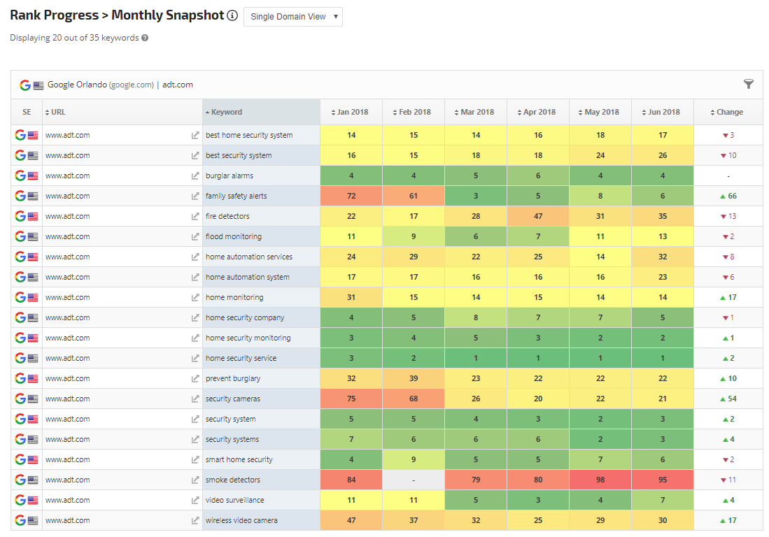 The Monthly Snapshot report colorfully displays your - and your competitors' - search engine rank changes on a monthly basis and includes the top ranking landing page for the last selected month.  A Change column calculates the difference between the rank for the first month and last month selected to display in the report, providing an overall rank change metric.