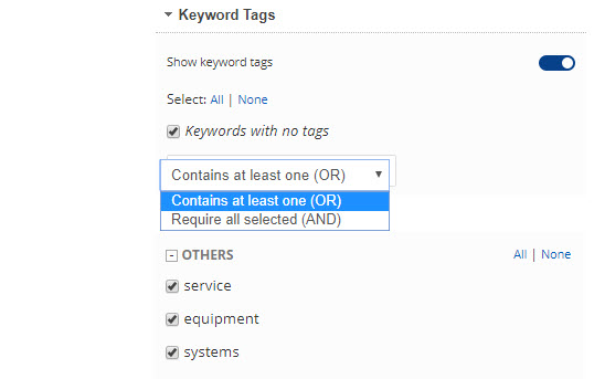 • Select a Tag Filter Contains at least one (OR) - this option will include any of the selected keyword tags Require all selected (AND) - this option requires all of the selected keyword tags in order for the keyword data to display in the report