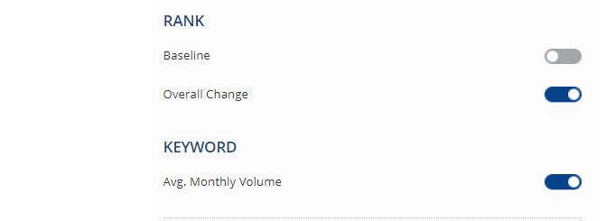 • Display Baseline by moving the slider to the right. Displays a column with the rank on the 1st day the keyword was added to the campaign, or if the keyword did not rank within the maximum supported results tracked by each search engine, then Baseline displays the first rank recorded by Rank Ranger for the Keyword when it did rank.