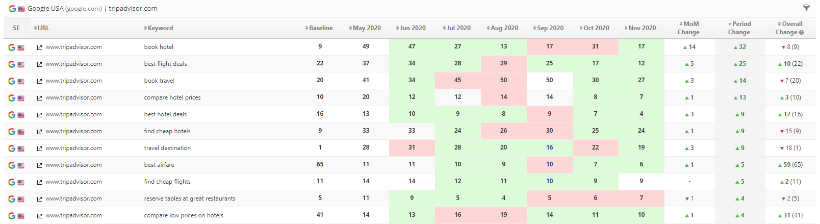 • Overall Change, then the difference between the baseline rank and the latest month displayed in the report is calculated and displayed in this column.