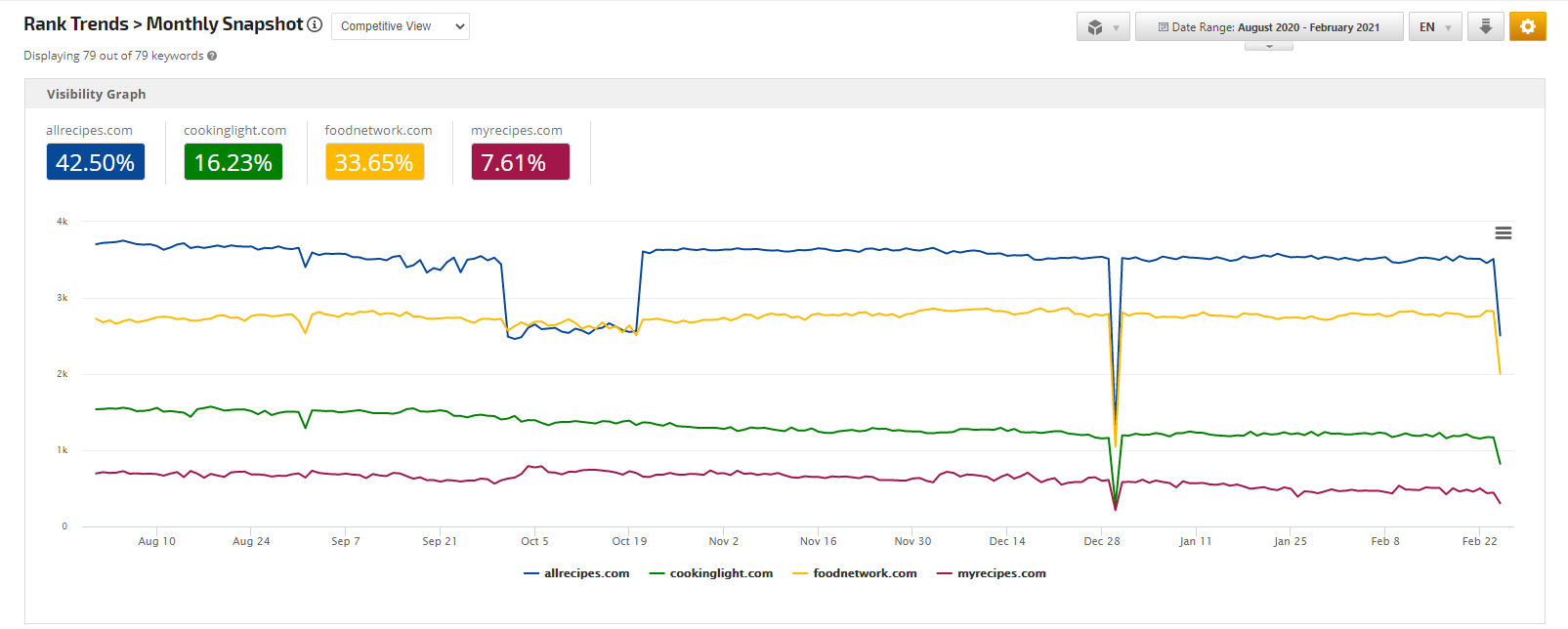 Monthly Rank by the search engine for the selected keywords, keyword tags, and date range.