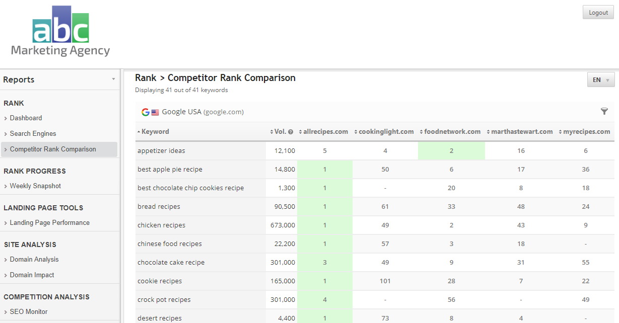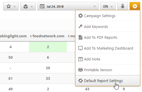 Rank Ranger reports allow for complete customization with regard to keywords, domains, search engines, and various rank, keyword, domain, and/or landing page metrics. Once you have customized your report exactly as you would like it to remain, you can easily save the settings as a report default. Available options include: