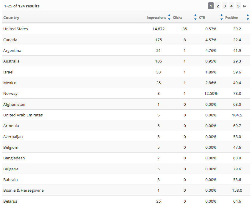 The Search Analytics Countries report provides a combination graph and table detailing the number of Impressions, Clicks, CTR, and Average Position per country. A custom filter makes it possible to filter the report by Search Type(tabs in Google Search), Country, Device, Page, or Query for a specific value.
