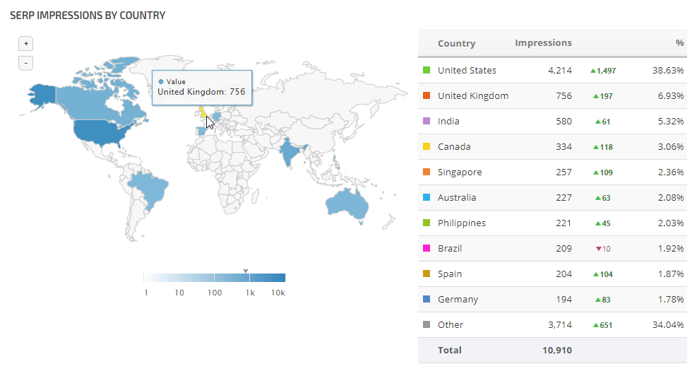 • Country, when country is selected a Map Chart option appears. If you enable the Map Chart, then a world map displays with darkened areas corresponding to the table results. If you disable Map Chart, then a Pie Chart displays if the option is enabled in Chart Settings.