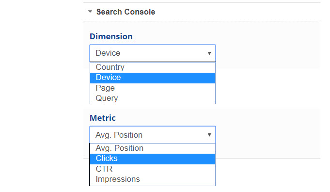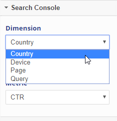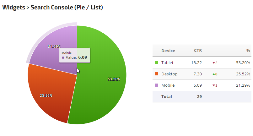 The Google Search Console Chart / List widget provides a colorful graphic presentation of search metrics from the website's Google Search Console account. A variety of display options include color palette, pie chart, column chart, map, and table list. Dimension options include country, device, page, and query. Metric options include average position, clicks, CTR or impressions. A compare to past option allows for additional analysis of either data value or percentage.
