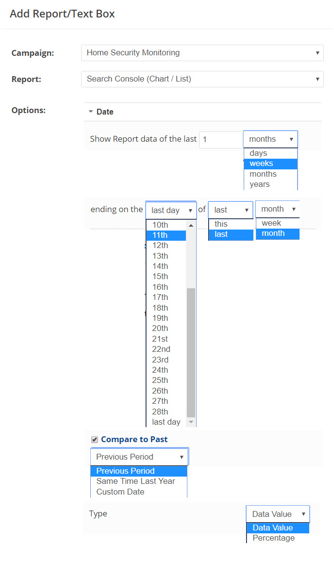 To change the number of weeks or months displayed in a specific report, click the gear icon for any marketing dashboard report element and expand the Date option section, enter the number and click the Save Button.