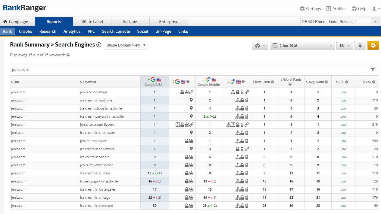 Google SERP Features including Local Pack, Knowledge Graph, Answer Box, News Box, Images, etc), AdWords ads and related search phrases, providing a full view of page one visibility for each tracked keyword.