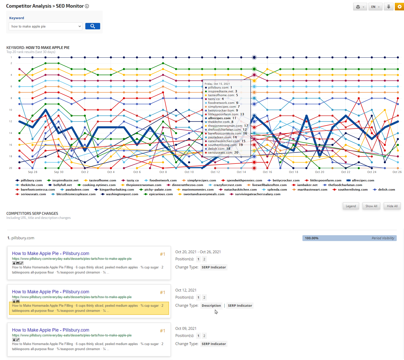 Use the SEO Monitor to conduct an in-depth analysis of the top 20 SERP competitors for each campaign keyword and search engine. The SERP Change report provides a daily SERP snapshot with title and description, landing page(s),
