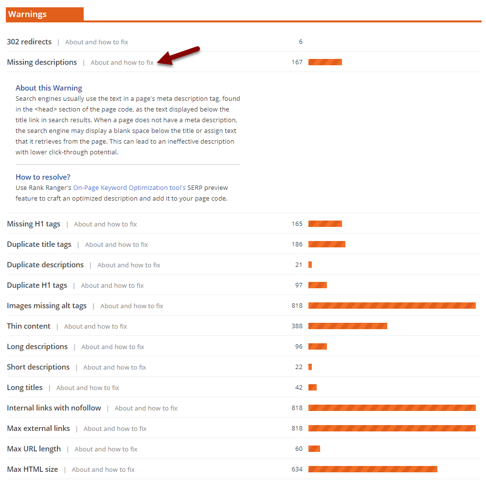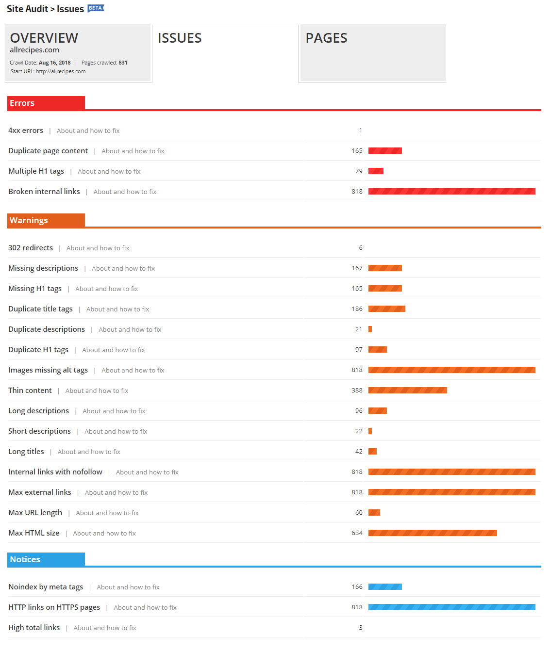 The Site Audit Issues report provides a list of the issues discovered during the website audit, along with an explanation of each issue and information regarding how to resolve the issues to improve SEO and search user interaction. There are three categories of messages in this report and they are listed in order of importance: