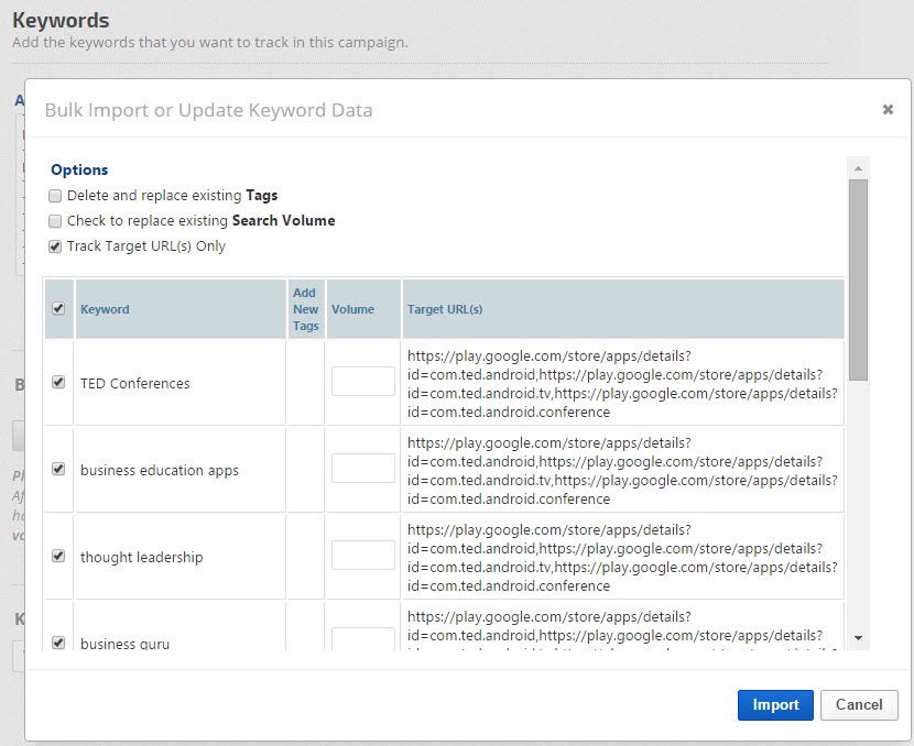 Manually add keywords and Target URLs or import them from the sample spreadsheet. In this example, we have added Target URLs for 3 related TED apps in the Google Play Store. When using the import file, this is an example of the correct format for the Target URL field (i.e., full URLs with a comma between each):
