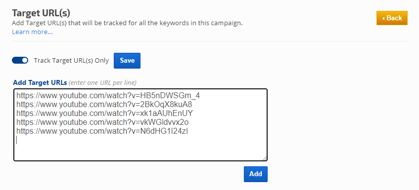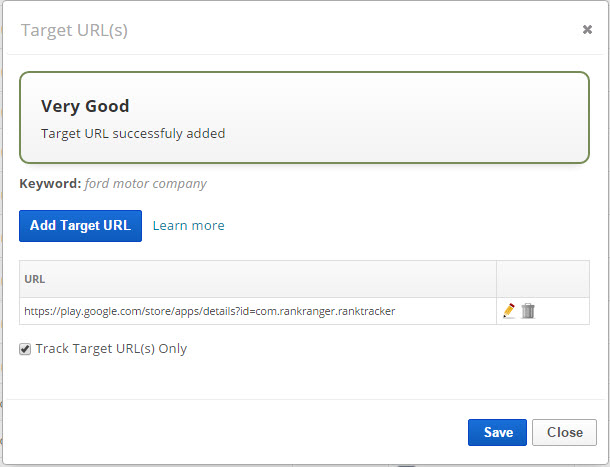 In this example we've added the following Target URLs to a keyword and checked the Track Target URL(s) Only box: