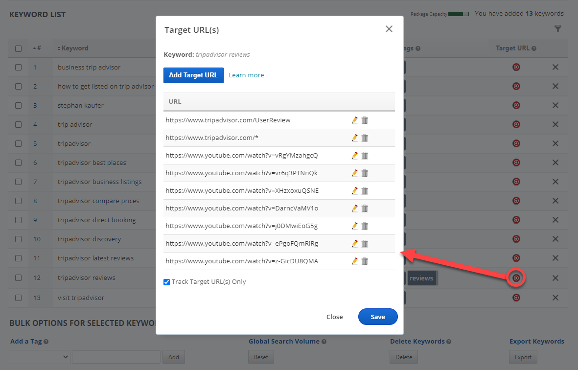 * Note: If in the above-mentioned screen the Target URL icons are not red, that means that the global Track Target URL(s) Only is not set. To reset the Track Target URL(s) Only scroll down to the Bulk Import or Update Keyword Data section of the Keyword Settings screen and click on the Target URLs link. Switch OFF the toggle for Track Target URL(s) Only and Save. Then switch ON the toggle again and Save. This will reset the Tracking for the Target URL(s) Only.