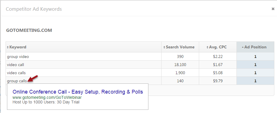 Hover over a keyword in the Competitor Ad Keywords screen and the actual AdWords ad displays, providing you with your competitor’s advertising copy in addition to the target landing page URL on their site.