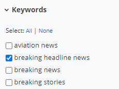 Note: If the campaign is tracking over 50 keywords and the first 50 keywords in alphabetical order do not score in Top Stories then the report will not display any records. Go to Report Options > Keywords and select those keywords that you would like to display in the report or select keywords by Tags in the Report Options > Keyword Tags section.