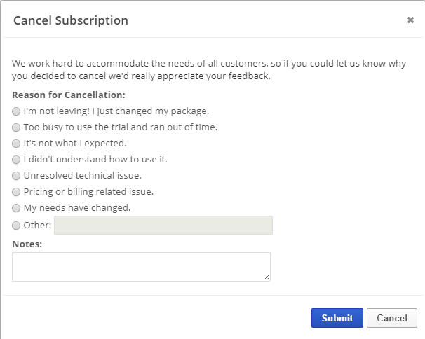 If you decide to cancel your package(s) we appreciate receiving as much information as possible regarding your reason, as this will help us identify any improvements we might need to make to our services. Additionally, prior to cancellation please ensure that you have downloaded any