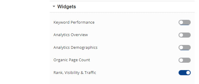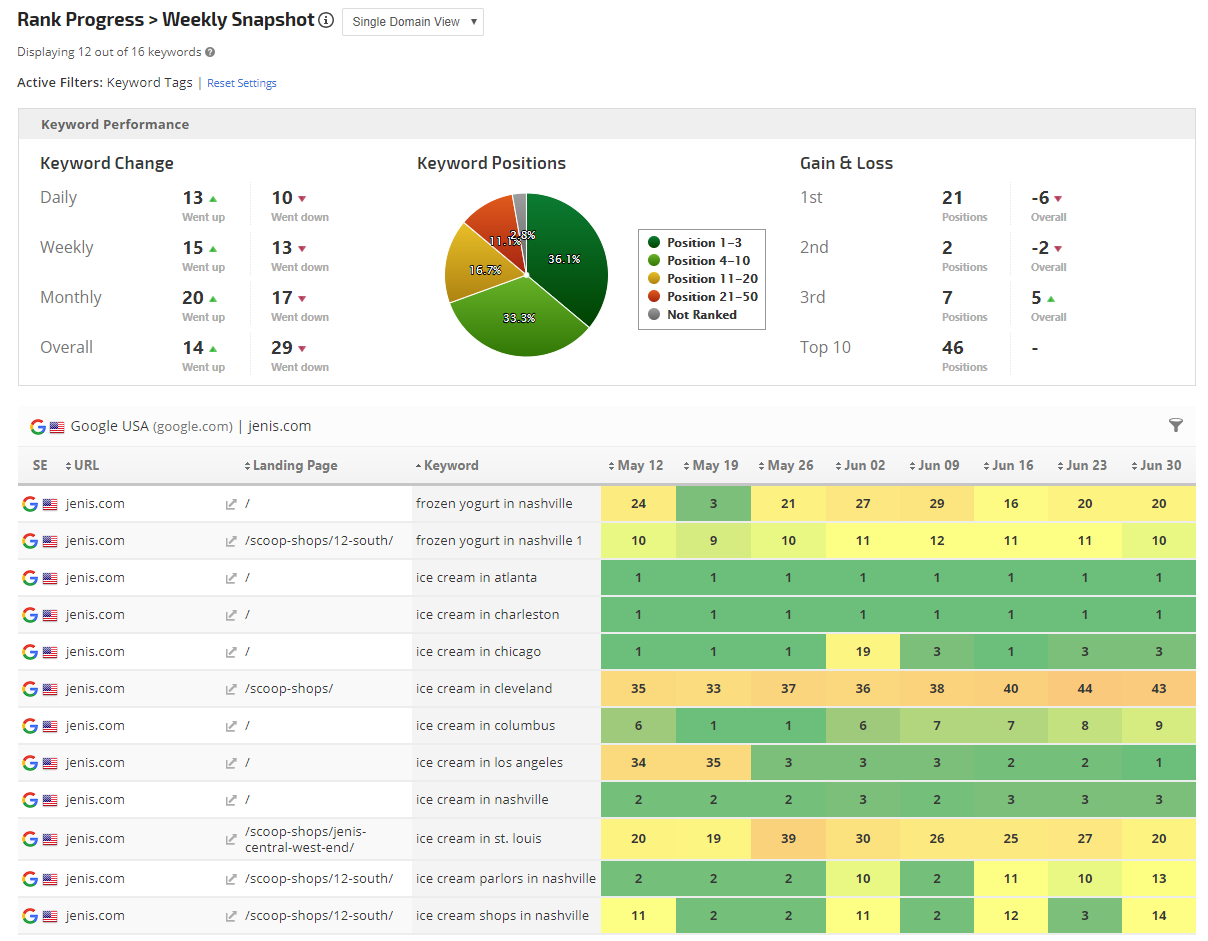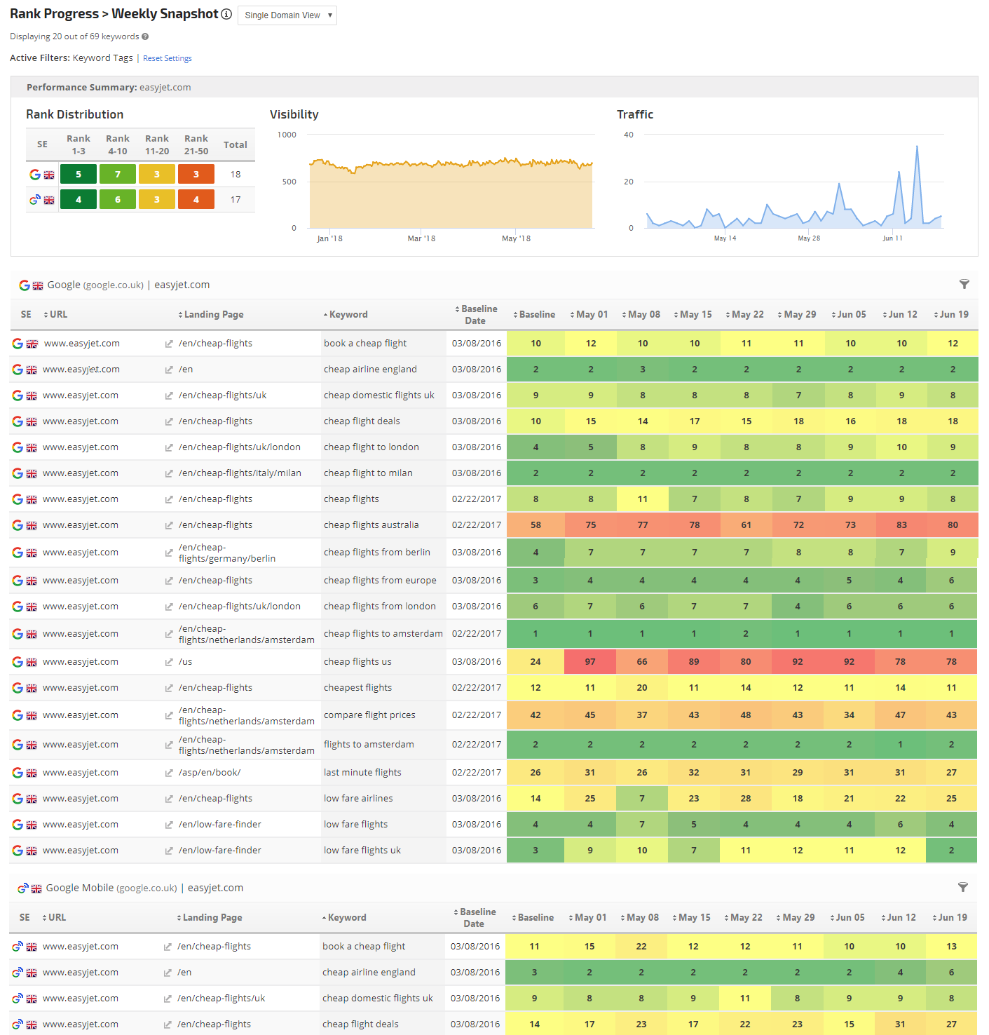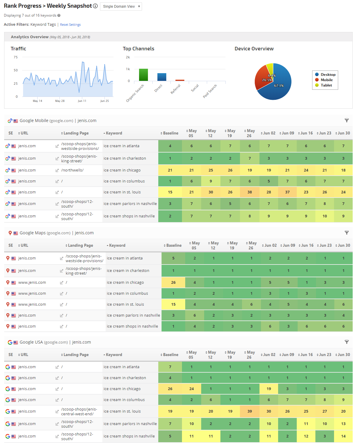 Employing a Rank Color Scale, the Weekly Snapshot report provides a powerful visual that colorfully displays rank progress from week to week during the selected date range for the tracked keywords and search engines. A Competitive View allows a comparison of a site's rank progress with its competitors.  Choose an SEO widget to display in a ribbon at the top of the report for an impressive summary of Keyword Rank Performance, Analytics Traffic, Audience Demographics, or overall Performance of Rank, Visibility, and Traffic.