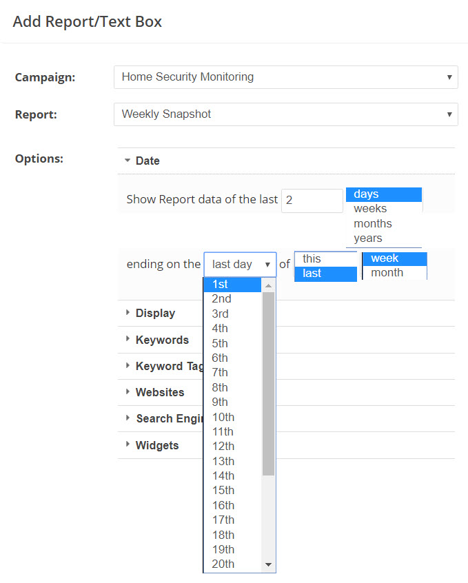 To change the number of weeks or months displayed in a specific report, click the gear icon for any marketing dashboard report element and expand the Date option section, enter the number and click the Save Button.