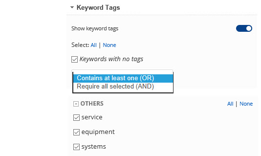 Require all selected (AND) - this option requires all of the selected keyword tags in order for the keyword data to display in the report.