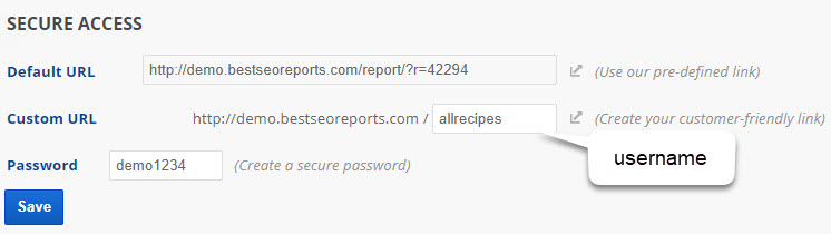 Please note: Your account username becomes the sub-domain in the URL (e.g., demo.ourreports.com), to have your account username changed, please contact customer service and they will check to see if your desired username is available). If you would prefer to use your own domain, you have an option to purchase White Label Custom Domain Service.