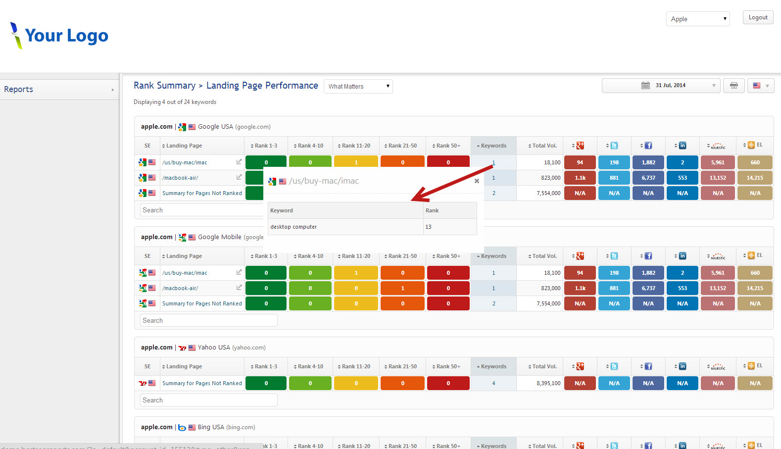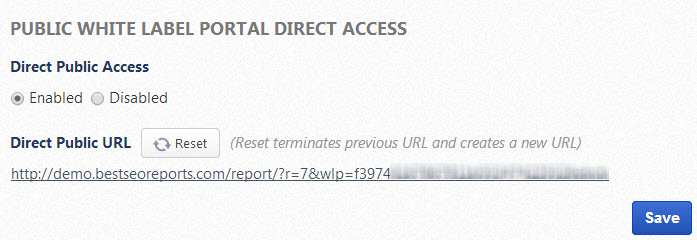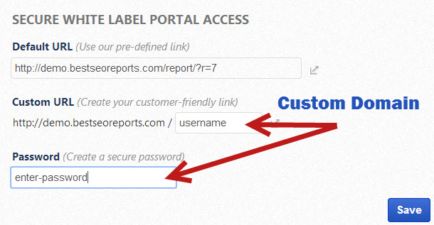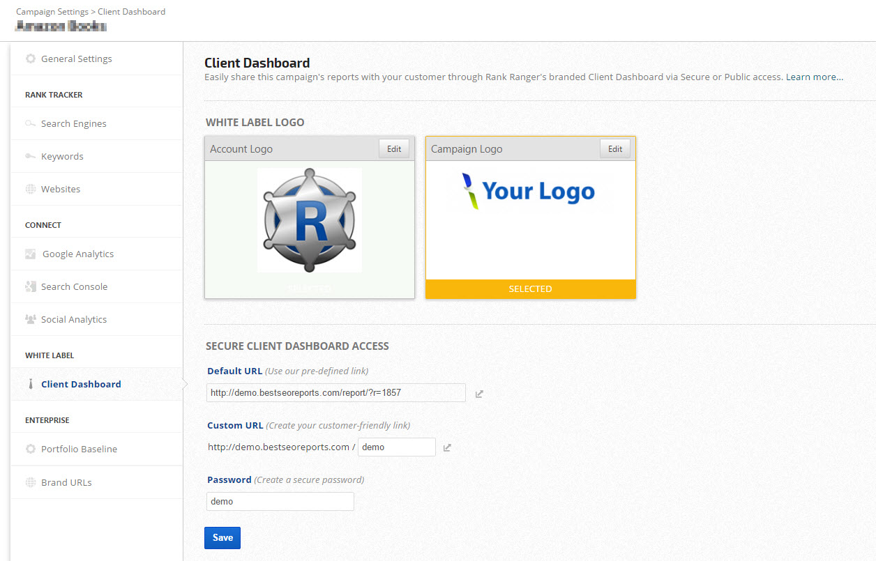 This feature allows you to provide your client with a customized online dashboard displaying our reports, under your logo. This is ideal for SEO companies and online marketing agencies that would like to give their clients the ability to be as hands-on as they like.