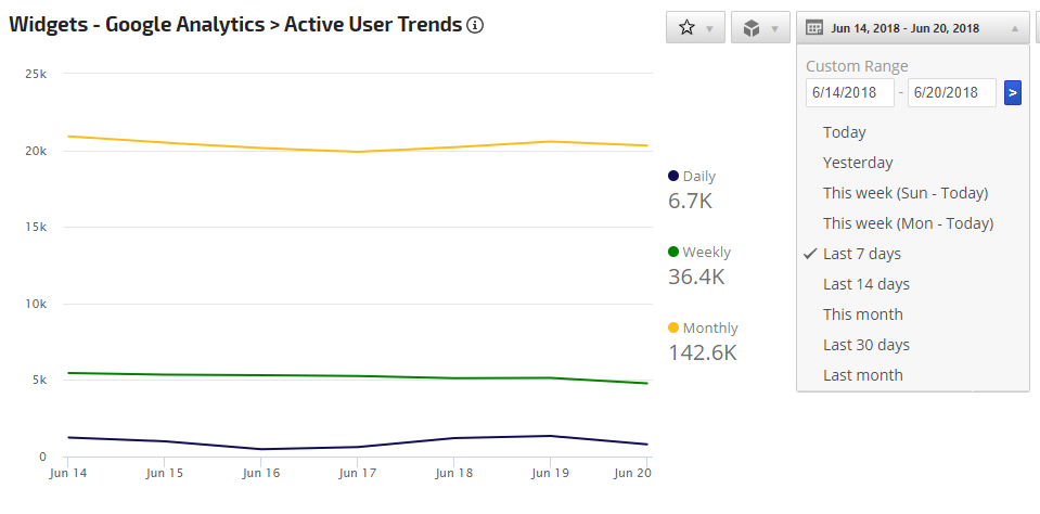 The Google Analytics Active User Trends widget presents daily, weekly and monthly totals for the selected analytics goals, segments and events.