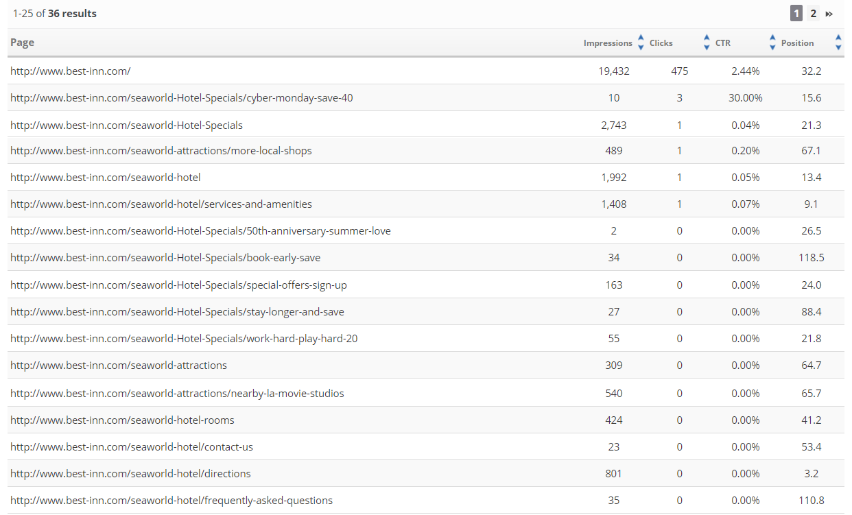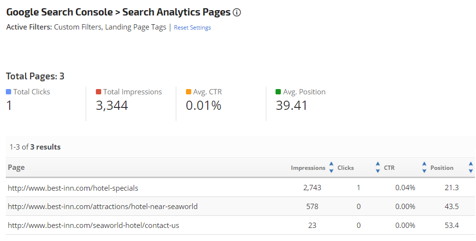 In addition to a custom filter set to "Page contains 'hotel'", Landing Page Tags were utilized to define a specific set of site pages. Landing Page Tags are available only in Enterprise-level packages.