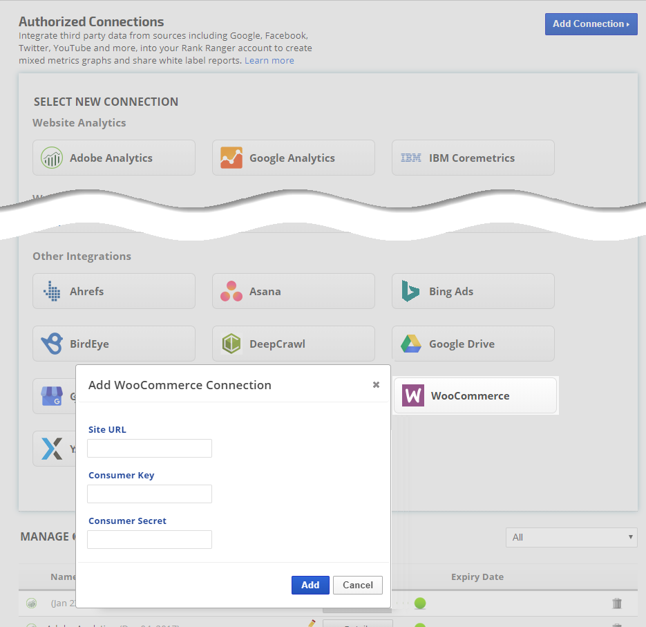 You can connect a campaign to your WooCommerce account if you'd like to include their e-commerce data for integration into your Rank Ranger graphs and widgets to display in white label dashboards and PDF reports.