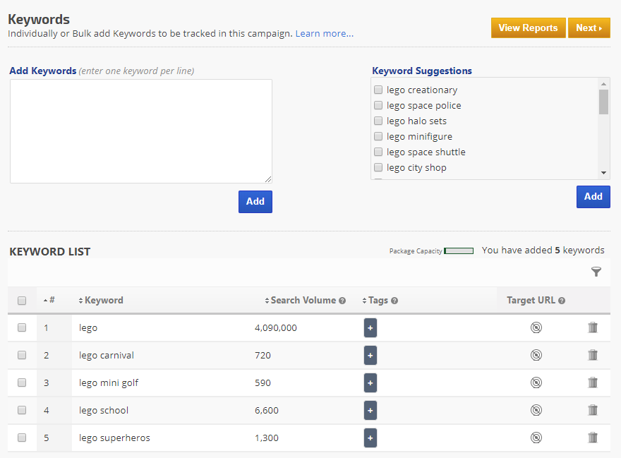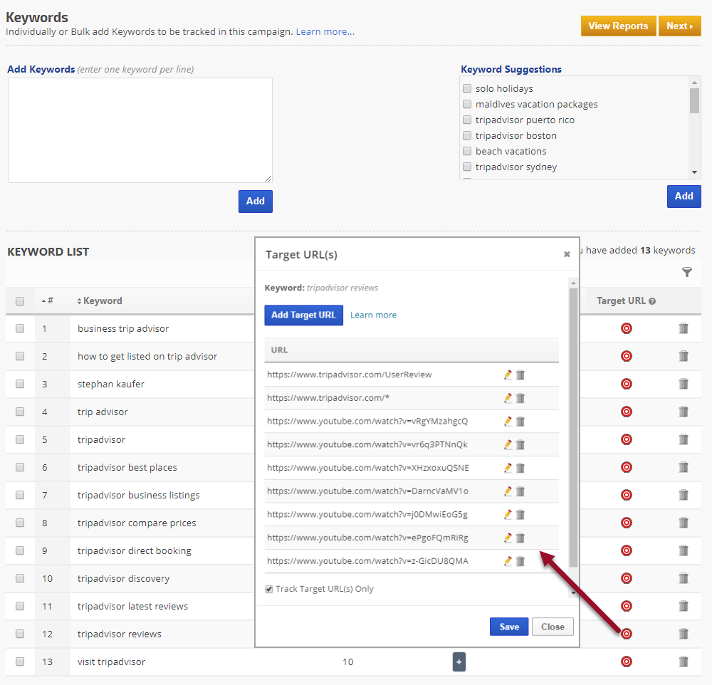 Keywords screen, manually add keywords and target URLs or import keywords with target URLs following the format in the sample spreadsheet that's available toward the bottom of that screen.