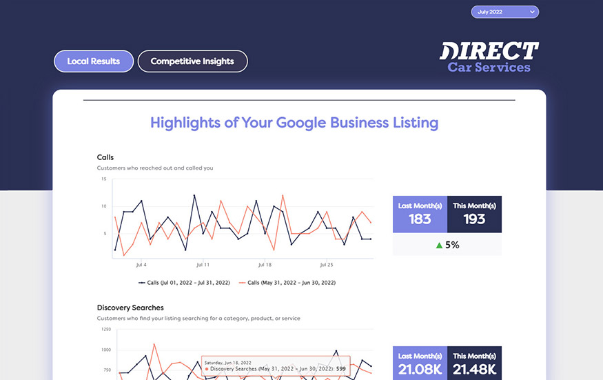 A comprehensive set of reports detailing how customers find and interact with your business listings on Google. Delve into a series of colorful data-filled reports providing you with the following information: